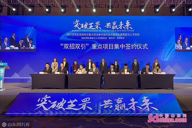 会上,播放了《遇见芝罘》城市宣传片和《慧聚烟台 共赢未来》烟台人才新政宣传片,康佳集团股份有限公司党委副书记叶兴斌、奇点控股有限公司董事长姜琳杰和烟台籍高端人才、中科院“百人计划”学者慈松代表与会嘉宾分别致辞。随后,举行烟台芝罘深蓝人才发展集团揭牌仪式和芝罘区“双招双引”重点项目集中签约仪式,集中签约康佳北方总部及新一代信息技术产业园、中电信创数字科技产业园、中农联农商智慧云仓、烟台AI与智能制造产业园、贝易资芝罘数字经济产业园、深蓝灵犀数智创新中心平台等22个总投资超过289亿元的重点项目,涉及数字经济、医养健康、现代金融、商贸文旅、海洋工程、数字影视、产才融合等诸多领域。其中,过10亿元项目8个、过30亿元项目3个,引进世界500强企业3家、中国500强企业4家、央企国企6家、硕士以上高层次人才10名。