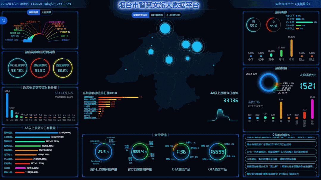 横向,对接公安、大数据、通信、金融等部门,融合同程、携程等OTA;向上,对接国家公共文化云、好客山东网、“云游齐鲁一部手机游山东”等国家、省平台;向下,接入烟台市各区市、文旅要素主体,构建全市文旅智慧“大脑”。已汇总数据超过12.3亿条,日增数据10余万条,在省内首家实现文旅数据资源全面融合。